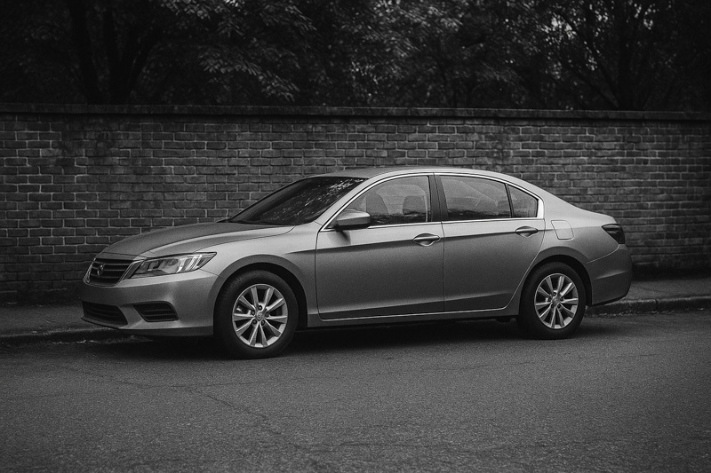 Prompt:Maak een zwart-wit documentairefoto van een zilveren sedan die geparkeerd staat langs een straat, met een bakstenen muur en bomen op de achtergrond. Gebruik natuurlijk licht, hoog contrast en een realistische, ongepolijste stijl
