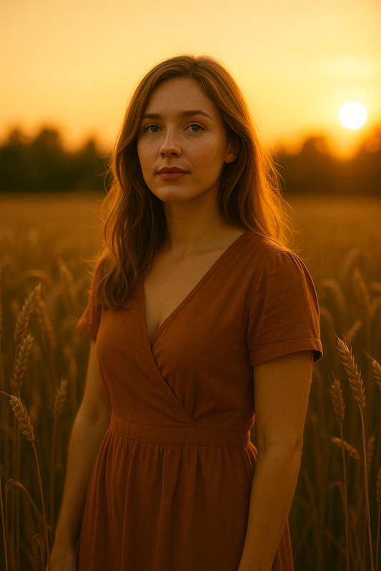 Prompt:Maak een realistische foto van een jonge vrouw die in een tarweveld staat tijdens golden hour. Warm, zacht avondlicht, rustige sfeer, natuurlijke kleuren, een lage zon in de achtergrond en een lichte onscherpte in de verte.”
