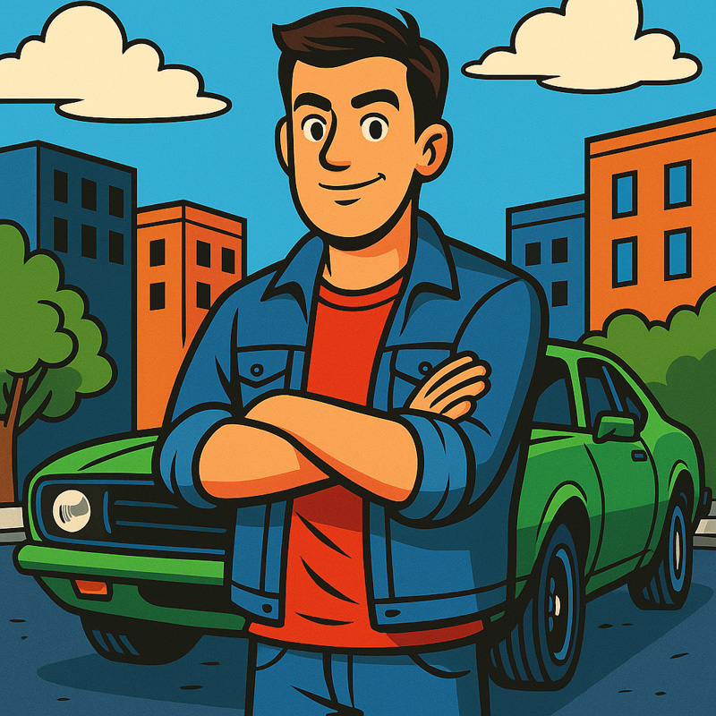 Prompt:Maak een kleurrijke cartoonillustratie van een jonge man die met gekruiste armen voor een groene muscle car staat. Gebruik een comic-stijl met dikke lijnen, felle kleuren en een stad op de achtergrond met bomen, gebouwen en een blauwe lucht met wolken