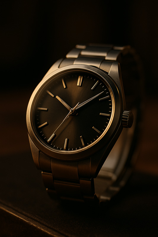 Prompt:Maak een realistische cinematic close-up foto van een luxe horloge met metalen band. Gebruik warm avondlicht, zachte schaduwen en een donkere onscherpe achtergrond. Laat het horloge haarscherp zijn met zichtbare textuur, reflecties en subtiele highlights.