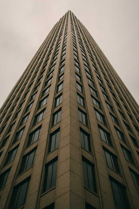 Prompt:Maak een realistische foto van een zeer hoog gebouw, gefotografeerd van heel dichtbij en recht omhoog vanuit kikkerperspectief. Strakke lijnen, dramatische compositie, natuurlijk daglicht, sterke verticale perspectieflijnen.