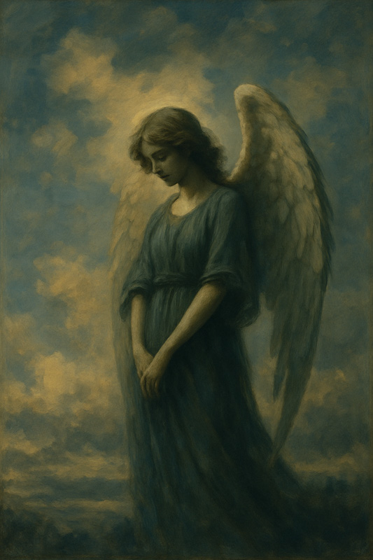 Prompt:Maak een dromerige en mysterieuze schilderachtige afbeelding van een engel die tussen zachte wolken staat. Gebruik warm, diffuus licht, zachte penseelstreken, gouden highlights, een rustige melancholische sfeer en een stijl die doet denken aan klassieke tarot-illustraties.