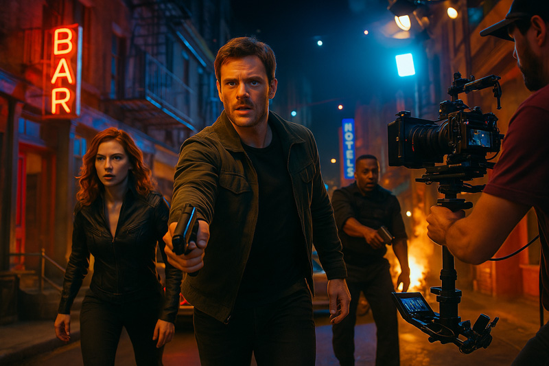 Prompt:Maak een kleurrijke cinematic filmstill van een actiefilm-set. Drie acteurs rennen door een straat vol neonlichten, rook en kleine explosies. Een filmcamera en cameraman staan op de voorgrond. Gebruik dramatische belichting, sterke kleuren, contrastrijke schaduwen en een stijl die doet denken aan moderne actiefilms.